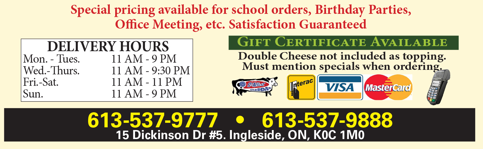 We offer you and your family delectable fully cooked meals to eat at our cozy Pizzeria or to take with you. Our Menu includes Pizza, Salads, Wraps, Calzone, Parmigiana, Souvlaki, Pasta, Subs, Hot Sandwiches, Assorted Sandwiches, Chicken, Triple Decker, Nachos and Side orders. You can also pick out a ready-to-cook dish or two. We can tailor a meal just for you, and of course, we do FREE delivery in Town.